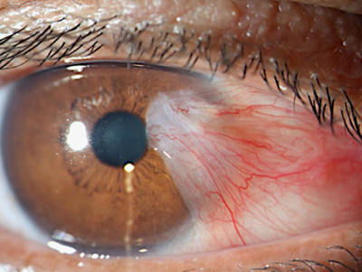 El Pterigión es el crecimiento de un tejido conjuntivo fibrovascular sobre la cornea, invadiéndola y en casos más severos cubriendo el eje visual y por tanto alterando la función visual.