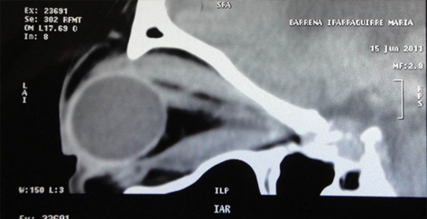 Resonancia magnética nuclear que muestra proptosis severa del globo ocular.